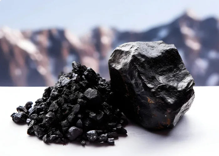 Οι ακατέργαστοι βράχοι Shilajit κατηγορίας Α προέρχονται από υψόμετρο άνω των 14.000 ποδιών από τα βουνά του Θιβέτ. Οι ακατέργαστοι βράχοι Shilajit κατηγορίας Α προέρχονται από υψόμετρο άνω των 14.000 ποδιών από τα βουνά του Θιβέτ.